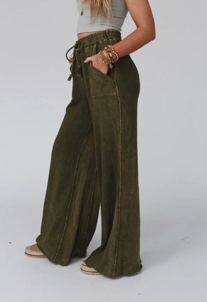 Cute pants that are fun, funky, and boho-comfy too?! “Yes” to a wide-leg silhouette with a draw-string waist in soft French Terry. Vintage fade makes these a casual favorite while visible seams, full length raw-edges, and outline pockets add to the relaxed vibe.
