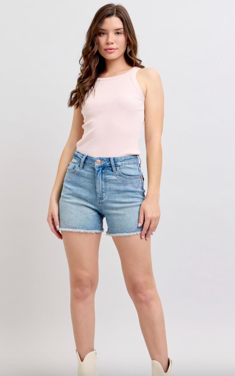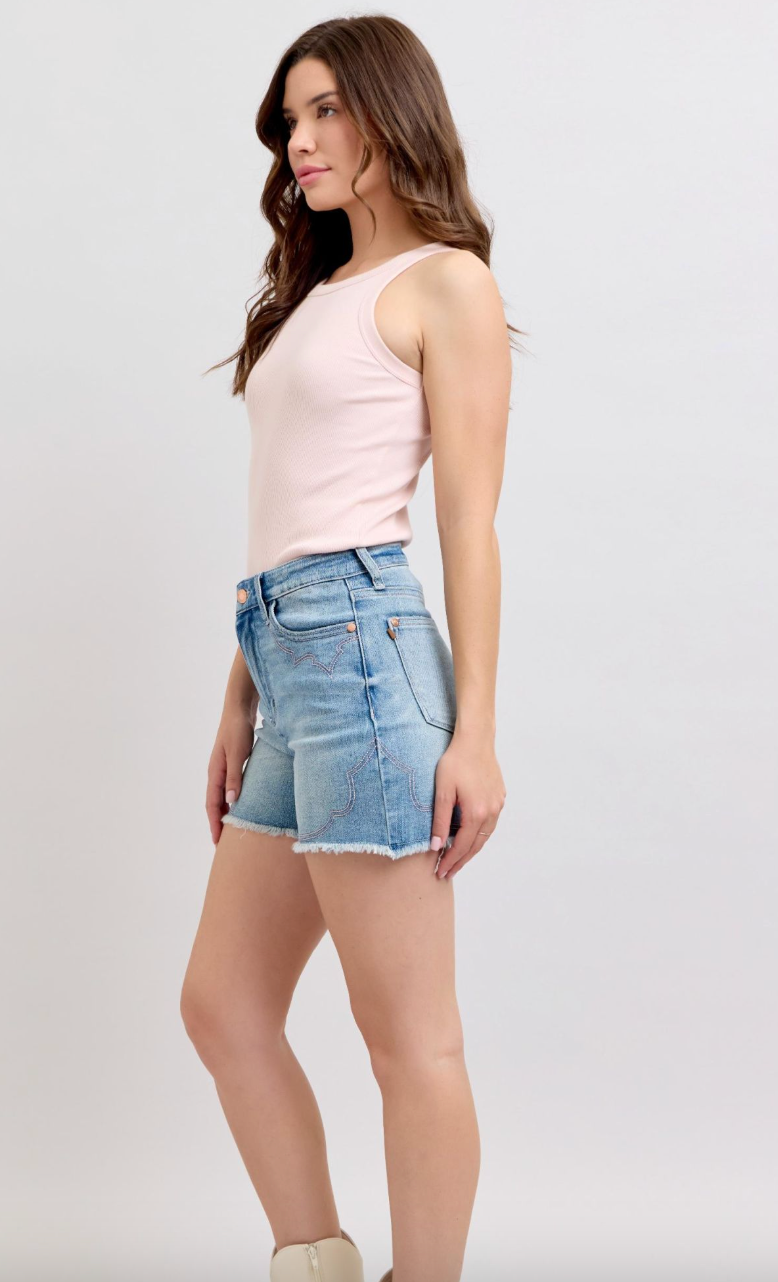 HW Western Embroidery Detail Cut Off ShortsRise: 11"Inseam: 4"MODEL INFO -Wearing a Judy Blue Size: SHeight: 5'8Waist: 25"Hips: 36"