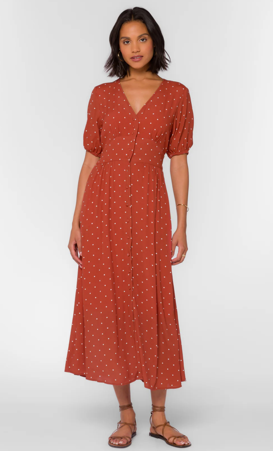The Livana is a midi dress with short elastic-cuff sleeves and a flattering V-neck button-front design. Featuring a smocked back for added comfort, it's crafted from semi-sheer, subtle textured, lightweight 100% Viscose in a warm Tajin hue adorned with charming white dots.