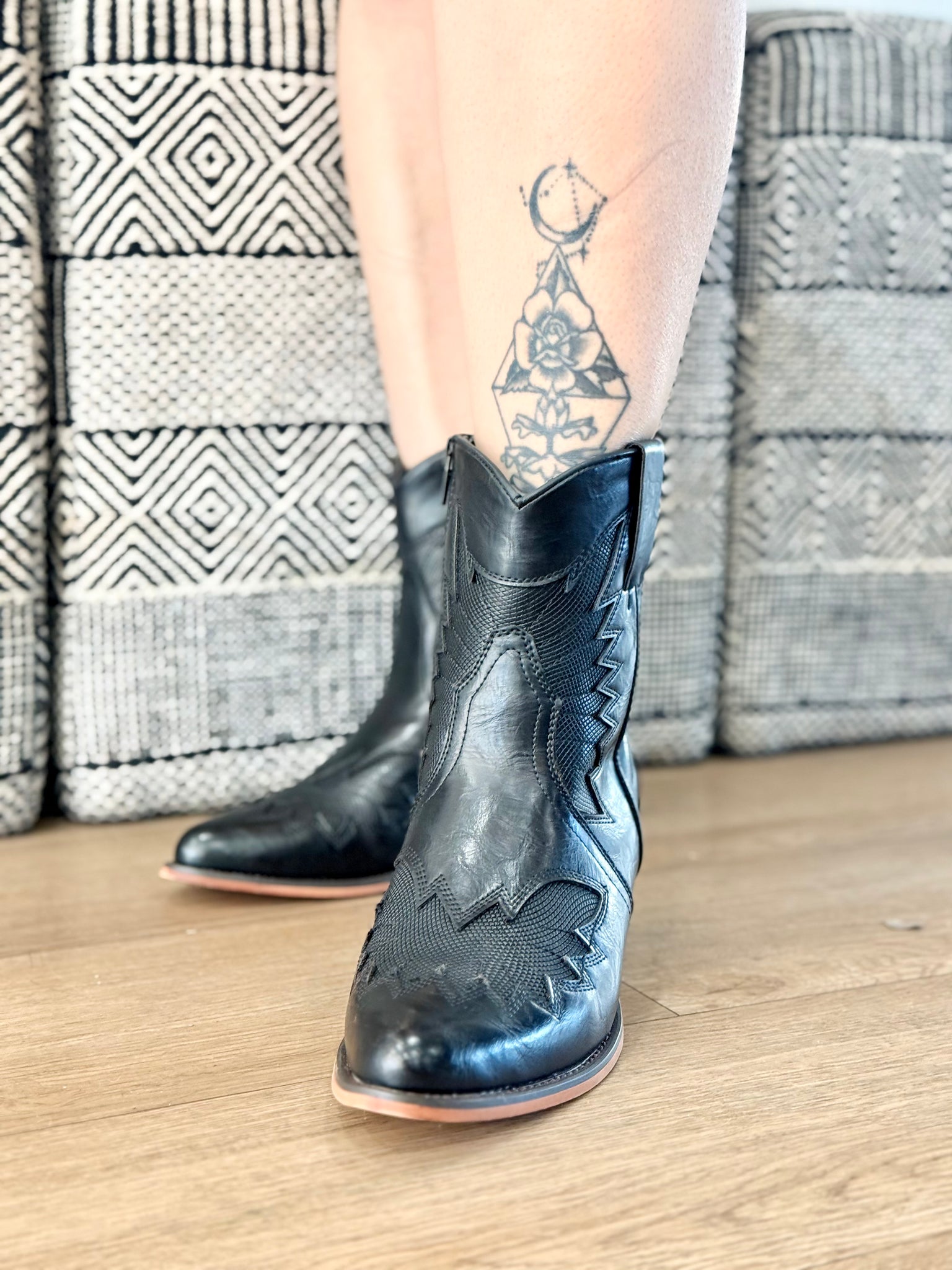 Ankle bootie in Black. Mixed material overlay. Heel height 2.5 Pointed toe, side zipper.
