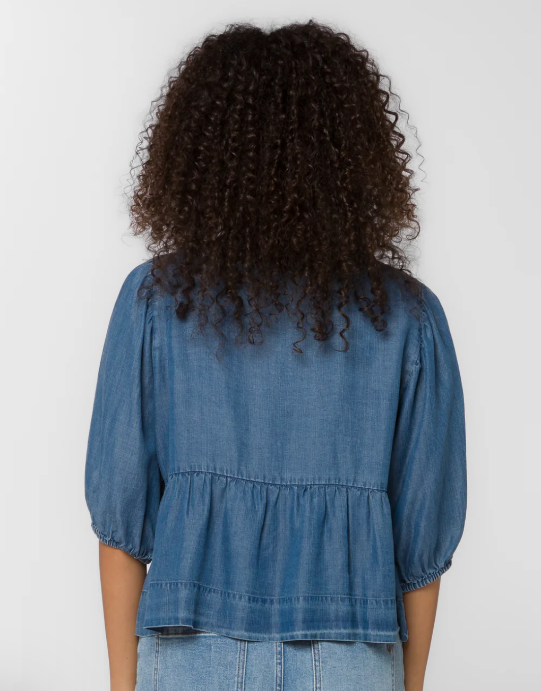This puff sleeve peplum top features a triple bow front tie, soft flowy drape and is smooth to the touch.