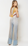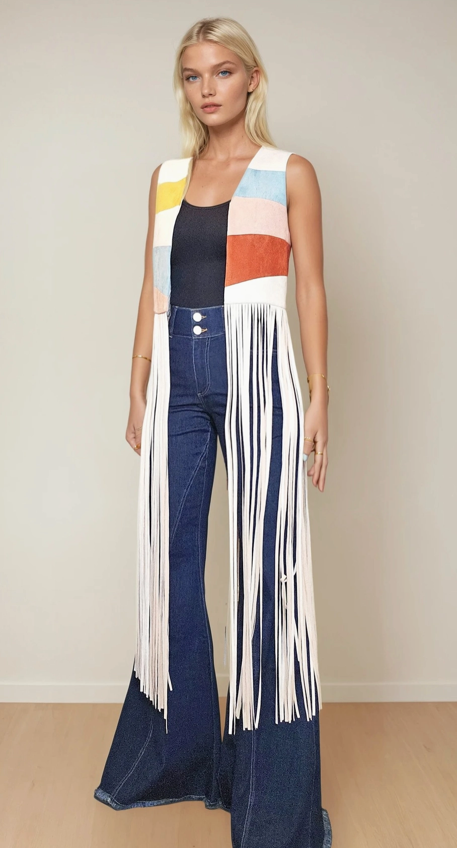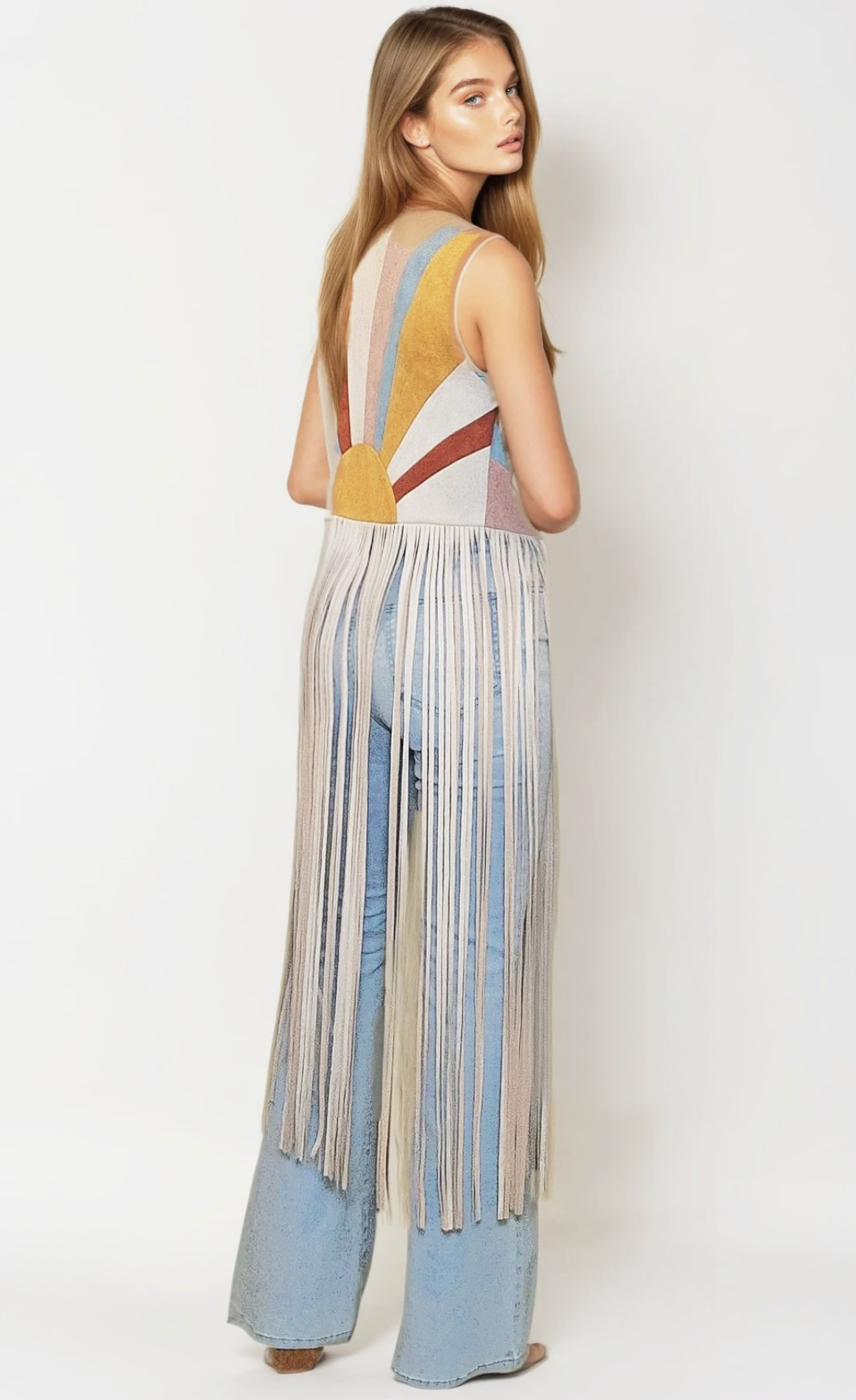 Wear the desert sunrise all day long with this color-blocked vest! Cut to fit like a glove and expertly constructed, this piece looks and feels as sharp as a cowboy's spurs, while the extra long fringe finish gives a dramatic, whimsical feel to every movement you make. Whether it's a dress, a tshirt, or a bralette and jeans, the pastel colors and flirty motion of this vest will make you the talk of the wild west.