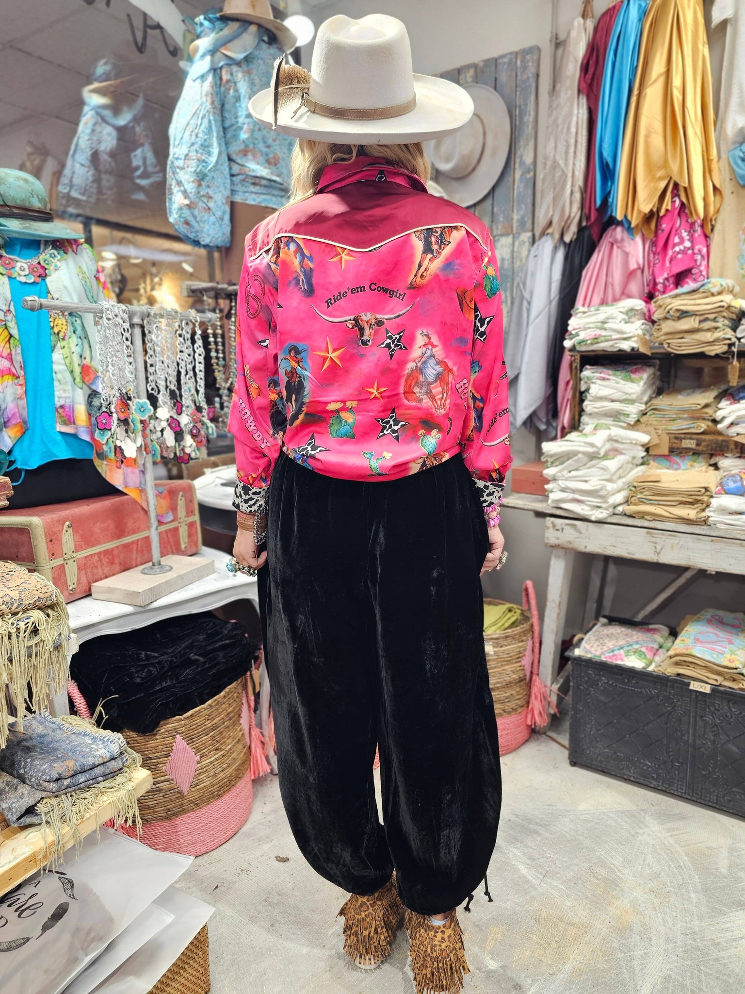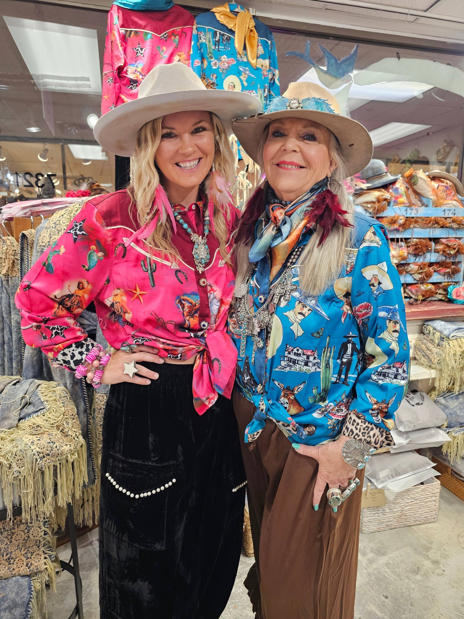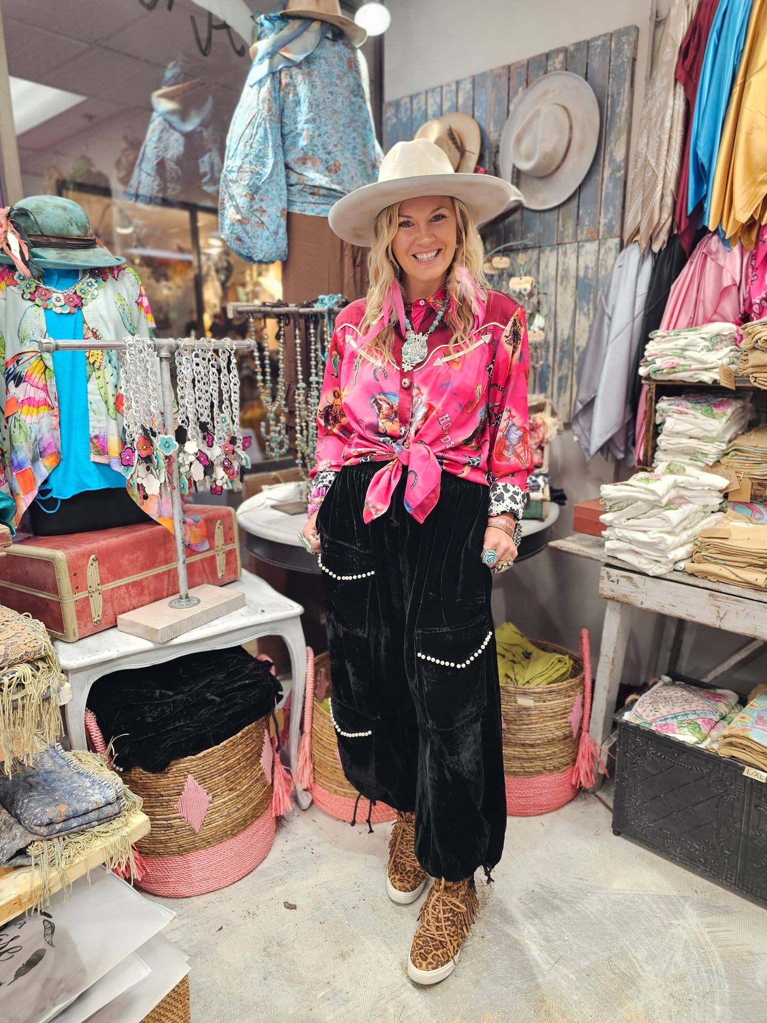 And I get gorgeous button covers with this shirt too??? Oh Wow! Incredible Satin shirt with contrasting cuffs and collar fits everyone! S/M and L/XL will fit a size 0 to a 20. Looks amazing with all of our fun pants, skirts or jeans! Two colors and prints. And pretty handmade button covers are included with each shirt . Selling fast so don't wait! *ALL ITEMS ARE OVERSIZED AND NOT U.S. STANDARD SIZING - DUE TO THE VINTAGE SHABBY CHIC STYLE IN WHICH THEY ARE DESIGNED*